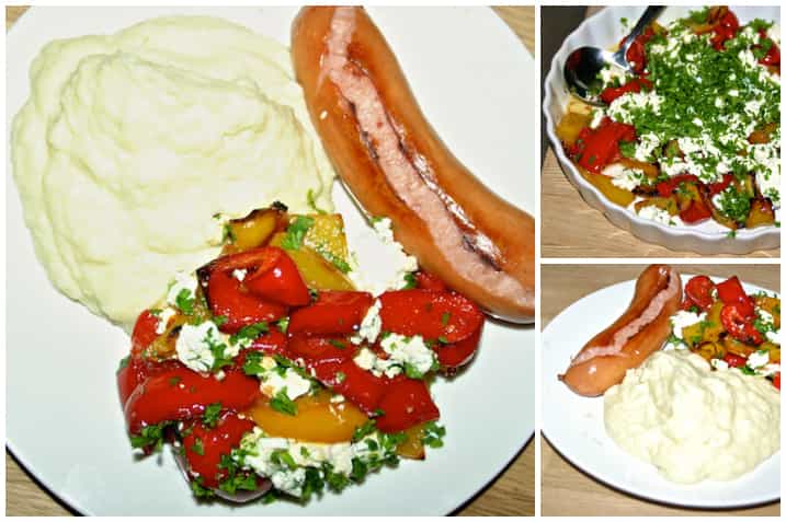Aftensmaden blev en god blomkålsmos, peberfrugter bagt i ovnen og vendt med feta og persille samt et par gode pølser, jeg fandt i Netto. Sidstnævnte blev jeg positivt overrasket over – højt kødindhold og kun 2 g kulhydrat – og så var smagen fortræffelig, selv for én, der ikke er den største fan af pølser normalt (læs: moi) 🙂