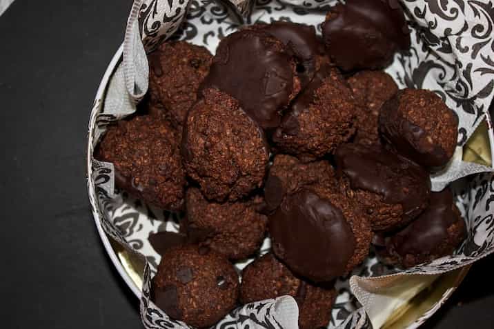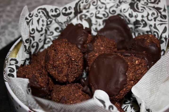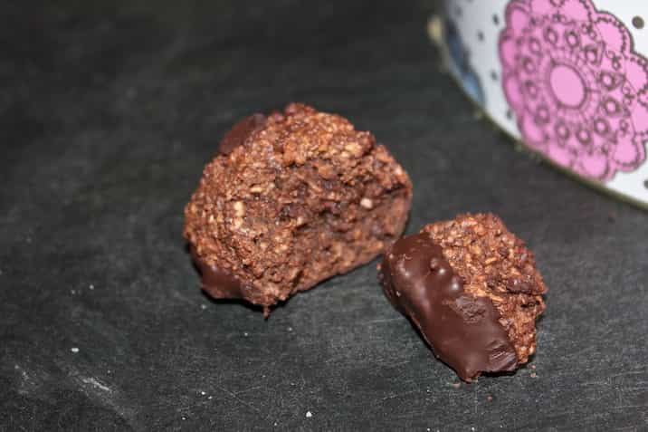 - Blend mandlerne, sukrin gold og chokolade til fint mel i en foodprocessor. Tilsæt så de resterende ingredienser på nær chokoladen til overtræk og blend, til du har en jævnt samlet masse.