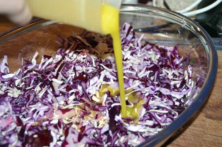 - Ryst/pisk limesaft og olie godt sammen og vend kålen med dette. Lad gerne trække ca. 30 minutter - fx mens spyddene er i ovnen.