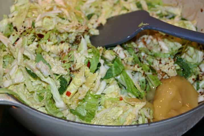 - Opvarm olien i en stegegryde eller den største gryde, du har (medmindre den største er en kæmpe suppegryde ;) ) Svits hvidløg og chili heri i et par minutter og tilsæt derefter kålen. Lad den svitse i et par minutter - den skal ikke tage farve - og tilsæt herefter balsamico og honning.