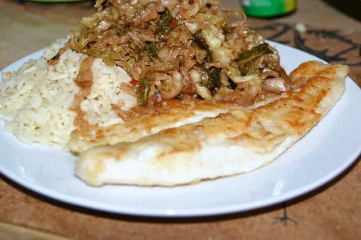 Man kan selvfølgelig helt selv vælge, hvad man serverer kålen til, men jeg synes at kombien med fisk vendt i lidt mel med salt og hvidløgspeber og stegt på panden plus ris er fantastisk. Det er også godt som rester dagen efter med ris og lidt sprødstegt bacon. Jeg tror også jeg har lavet det til kartoffelmos engang, hvilket nok også var fint (jeg kan dog ikke helt huske det). Men alle muligheder er selvfølgelig åbne, da det jo “bare” er et tilbehør. Men I må i hvert fald love mig, at I prøver det – det vil I ikke blive kede af 🙂