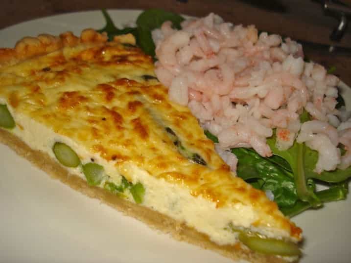 De eneste ændringer, jeg har foretaget, er at udskifte halvdelen af melet i tærtedejen med hvid hvede, tilsætte salt plus at koge aspargesene i bouillon. Og så brugte jeg cremefine 7 % i stedet for alm. madlavningsfløde. Desuden har jeg forøget rejemængden fra 50 g pr. pers. til 100 – jeg kan ret godt lide rejer 😀