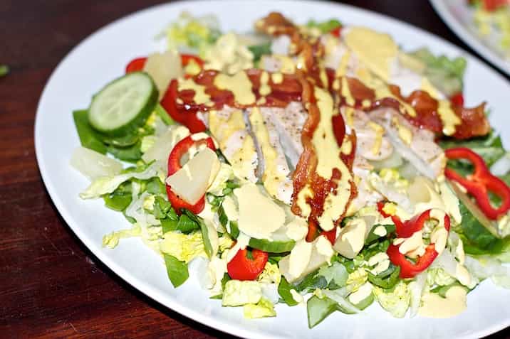 Men det betyder jo ikke, at nogle sandwicher ikke kan være ret godt fundet på, sådan rent fyldmæssigt. Og heldigvis er der jo absolut intet i vejen for, at man bare kan nøjes med fyldet i så fald (det har jeg fx også tidligere gjort her). Faktisk vil jeg næsten vove at påstå, at det er både nemmere, lækrere og sundere – hvis vi sådan skal sammenligne. Her har jeg taget den klassiske clubsandwich og brugt den gode ide (ja, kylling, bacon og karrydressing er altid en god ide!) til en virkeligt lækker måltidssalat i stedet. Jeg har desuden tilladt mig at tilføje lidt ananas også bare for at få lidt fest i gaden, I ved 😛