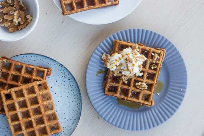 Som topping kan man jo selv vælge, hvad man har lyst til. Jeg besluttede, at en klat flødeskum, noget sirup og nogle nødder var det bedste valg. Jeg ville helst have haft pekannødder egentligt, men der tømte jeg mit lager til pekantærten for nyligt, så i stedet gik jeg med valnødden, pekannøddens mindre lækre kusine. Sorry, valnød. Og sirup er jo et must, når vi snakker vafler – i hvert fald hvis du spørger mig.
