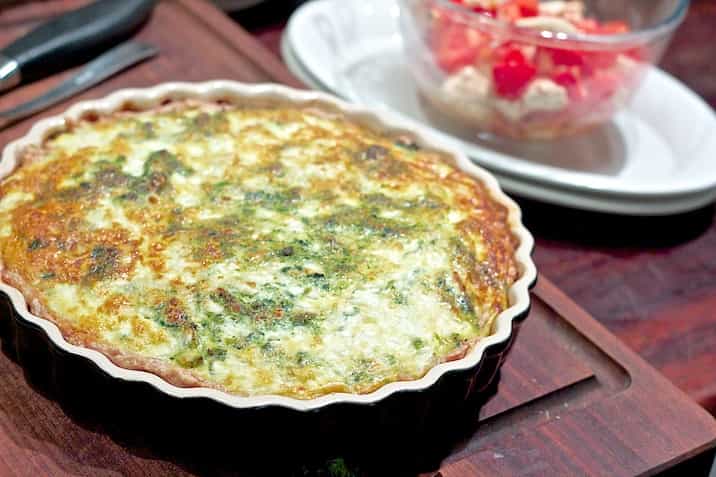 - Når bunden er forbagt, fordeles grøntsagerne i bunden og æggemassen hældes over.