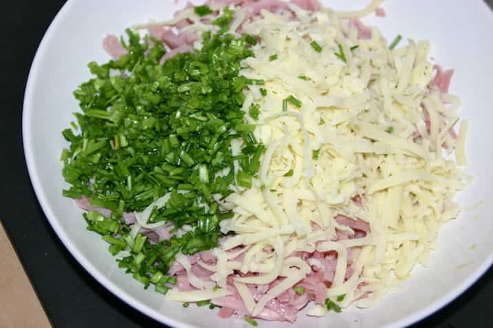 - Rør mandel- og kokosmel i og tilsæt herefter purløg, skinke og ost.