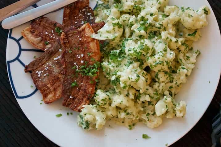 Men nu, for at gøre en kort historie lang og derefter forkorte den igen, blev jeg altså den søndag for et par uger siden omvendt fra ikke flæsk-spisende person til stegt flæsk-fan. Derfor hoppede jeg straks på, da Netto havde tilbud på øko-flæsk i denne uge, og benyttede fluks muligheden til at lave en LCHF-udgave af den gode gamle danske klassiker. Som nævnt, serveres stegt flæsk jo, så vidt jeg ved, traditionelt set med kogte kartofler og en klassisk opbagt persillesovs. Og det var da også det, vi fik det med, da vi spiste ude. Men jeg ville jo gerne lave en mere LCHF-venlig version. Selve flæsket (apropos: det er bare ikke et charmerende navn til en udskæring/ret!) er jo meget LCHF-venligt, når man bare tænker på kødet. Men det er hverken kartofler eller sovs lavet på hvedemel og mælk. Derfor besluttede jeg mig for i stedet at prøve med noget blomkål og fløde – det virker næsten altid! Og lad mig bare sige, at det gjorde det bestemt også denne gang! Nøj, hvor var det lækkert – og jeg, som ellers faktisk elsker kartofler og “klassisk” sovs ret højt, savnede det overhovedet ikke. Blomkålen i persillesovsen passede perfekt dertil og alt i alt blev det vist endnu en af de dér “overtalelsesretter” – altså retter, man kan servere for LCHF-skeptikere 😉