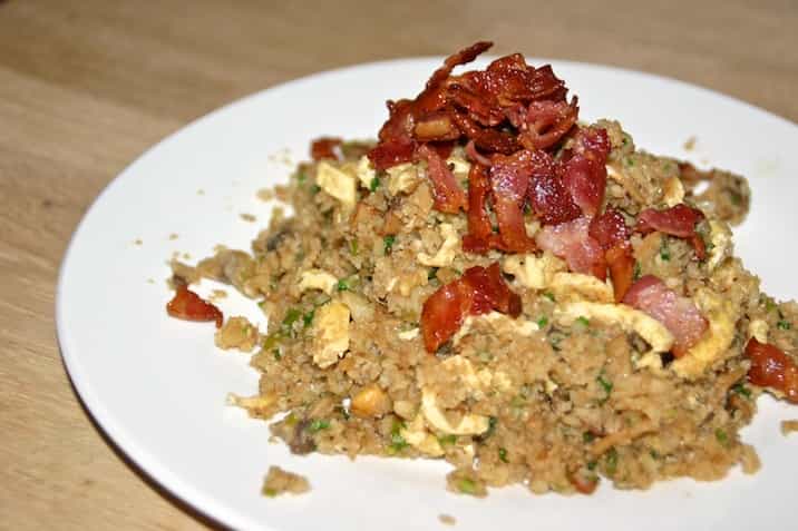 Jeg tænkte egentligt ikke videre over det i går, da jeg lavede og spiste aftensmad, men dette er faktisk en forholdsvis sær ret, når man tænker over det. Ellers også kan man bare være snedig og kalde det en fusionsret 😀 Det var i hvert fald til dels det, retten ledte tankerne hen på for mig. Blandingen af de asiatiske smagsindtryk, som fx ingefær, forårsløg og soja, og de mere “almindelige” og dagligdags smage, som blomkål, bacon og æg, giver på én og samme tid et både sjovt, sejt og sært resultat. Men nogle gange er det jo nok også meget sundt – og skægt – at prøve noget nyt 😉
